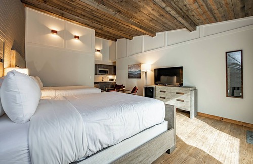 Escape to this quiet respite featuring two queen beds. Equipped with a kitchenette, Smart TV, and a luxurious bathroom with walk-in shower and quality bath products. Walk right out to the deck where you have two chairs to take in the morning air and go for a walk down to the lake. Bring your canine companion on your lake adventure and reside in one of our designated Dog Friendly rooms where easy access to grass and trees are right outside your door.