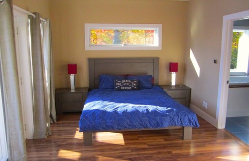 The Hemlock House offers all the amenities one can desire. Polished concrete floors, white walls and beamed ceilings create an airy, open space for the House’s modern furnishings and artwork. The first floor features a modern and fully equipped kitchen that will accommodate both cooking enthusiasts and professional chefs alike. The dining room table easily seats six and there are three additional seats at the adjacent breakfast bar. The floor to ceiling window walls in the living room are the main attraction supported by colorful and comfy modern furniture.