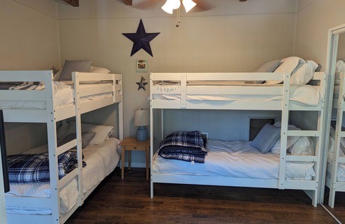 The cozy cabin offers 3 bedrooms. There are 2 bedrooms on the main floor (one with a queen and one with a twin/trundle. Downstairs boasts the bunk room (sleeps 4) and separate den.