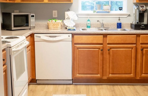 The spacious kitchen has a four-chair table, plenty of storage space, appliances, pots and pans, and dining wear. It is fully stocked for your cooking needs. A laundry room is also attached.