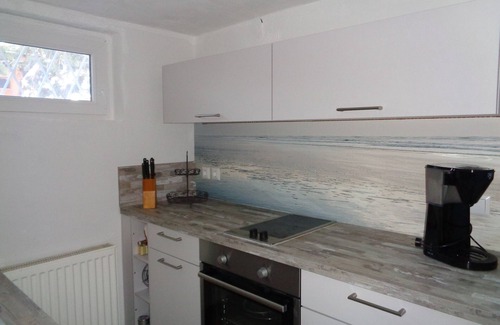 It consists of 1 bedroom with double bed and wardrobe, bathroom with floor-level shower, sink with mirror cabinet and toilet. In the kitchen there is a stove with 2 hot plates, oven, dishwasher, sink, fridge with freezer, coffee machine with thermo jug and a microwave. The living room is furnished with a sofa bed 172x200 cm, living room table, dining room with 4 chairs and wall unit with TV and satellite dish.