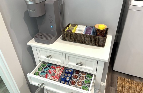 The kitchen is fully stocked with high end pots and pans, baking set, storage containers, mixing bowls, measuring cup, wine glasses, dishwasher, microwave, full stove, blender, Keurig coffee maker with pods, sugar/sweetener, creamer, and tea.