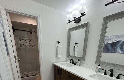 The bathroom first greets you with a newly installed double-sink vanity with a surplus of storage stocked with towels and marble countertop space for each side. Further inside, the tile walk-in shower and soft-close toilet lie behind a lockable door for privacy from bathroom vanity users. The walk-in shower has a corner stone-top seat as well as a built in convenience shelf for positioning any shampoos, conditioners, etc.