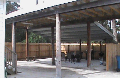 The outside of the house it is equipped with a very large covered area that includes a quiet seating area with patio lights, charcoal pit and a gas grill.