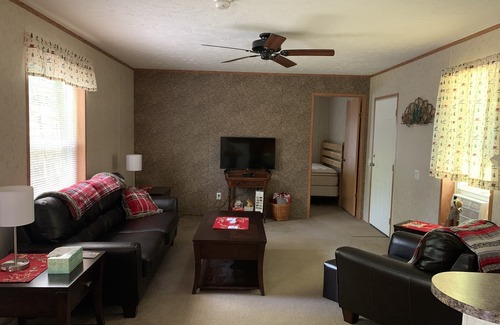 Two bedroom comfy home sleeps 6. Large bathroom. Master bedroom features queen bed. Second bedroom has a bunk with twin on top and full on bottom as well as a single twin. Futon in living room folds out to full bed and can accommodate a guest as well.