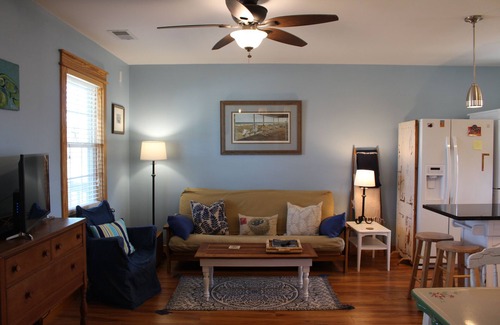 This charming house, called "No Name Cottage", is situated minutes from historic downtown Beaufort with a modern interior and all the comforts of home. Two bedrooms and one bathroom will comfortably accommodate 4. Ample off street parking. Large fenced-in back yard with room to park a boat trailer if you're looking to spend time on the water, which can be accessed by the public boat ramp down the road. After a busy day on the town or the water, the quiet backyard is perfect to unwind by the fire pit, enjoy meals at the picnic table or read a book on the screened porch off of the master bedroom. Come relax at the Crystal Coast!