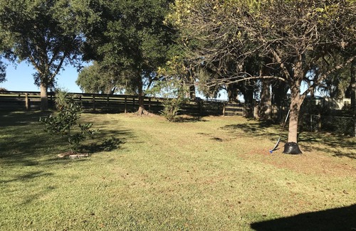 Nestled in a quiet neighborhood, and backed up to a huge horse farm with giant oaks with dangling moss, this house in southern Ocala in horse country is peaceful and quiet while sporting all the comforts of home. We have added a furnished lanai with a sleeper sofa - a perfect place to have that morning cup of coffee or tea. We have large screen TVs in MBR, LR and kid's room and we featured a full kitchen for cooking and preparing meals. Add a huge fenced backyard facing a horse farm, this place is made for relaxing and for kids and dogs to run. Only 12 miles to the World Equestrian Center and even closer to the Florida Horse Park. Visit the many natural springs in Ocala, especially Rainbow Springs State Park for GREAT tubing down the Rainbow River. Use of garage for vehicles is by owner prior approval. Small dog are allowed after approval by owner.