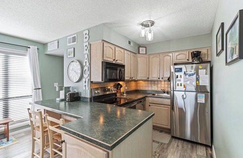 Step inside to the spacious living area, where you'll be greeted by light, airy décor and plenty of natural sunlight streaming in through sliding glass doors. A queen-sized sofa is provided for additional accommodations. Start your day with a cup of coffee on the porch, taking in a spectacular Outer Banks sunrise over the ocean, or unwind with your favorite beach read while listening to the soothing sound of the waves. The modern kitchen has stainless steel appliances, including a stove and dishwasher, making meal prep and cleanup a breeze. The dining area, with comfortable counter stools and easy-to-clean vinyl flooring, is perfect for enjoying meals together. As you pass through the hallway, you'll find the cozy Daybed Nook, an ideal spot for kids to have their own space while staying close to the family. They’ll have convenient access to the full hallway bathroom. The King Master Bedroom is a peaceful retreat with fresh, cozy bedding, a flat-screen TV for entertainment, and a private en-suite bathroom with a shower, tub, and all the comforts you need.