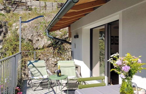 Located on the top floor of the house, the mountain-side holiday flat nestles charmingly against the rock face. The spacious roof terrace leads to the entrance of the flat via the staircase on the left. The light-flooded living and dining area includes a fitted kitchen to the side, a double sofa bed on the lake and pool side and access to a wide balcony that offers a breathtaking panoramic view of the lake.