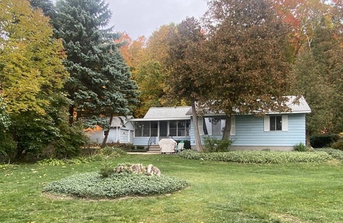Find your perfect getaway at Lake Leelanau in this charming home that boasts 160 feet of beautiful private lakefront! You can comfortably host up to 6 guests across three welcoming bedrooms—enjoy the spacious king bed, a cozy queen bed, and two twin beds. Also, there's a sleeper sofa for extra convenience. The warm dining room is perfect for family meals and fun game nights together. In the living area, you’ll find plenty of seating, and the sun porch is a lovely spot to unwind and take in the stunning views, come rain or shine!