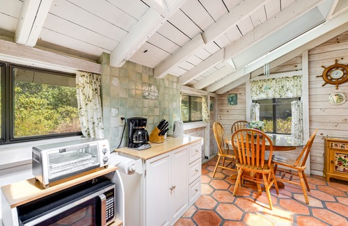 The Dune Flower, one of four cabins in the Mendocino Coast Dunes Retreat complex, is a great place for a small group to stay, though it can also be rented together with the other three houses for a fun-filled group vacation! This cabin has a charming nautical theme, a clean and comfortable design, and a dog-friendly attitude, so everyone will love it here! Up to four people are may stay in this one-bedroom, one-bathroom home which features a full-size bed in the bedroom and a comfortable fold-out futon. Feel free to bring your dogs to enjoy the vacation with you, though a nightly fee per dog and minimum fee per stay will apply. With a delightful nautical theme, you will feel very welcome in the living area, which comes complete with a TV, a DVD player, free WiFi access, and a cozy gas fireplace. There is no full kitchen, but the kitchenette offers a mini-fridge with a freezer, a microwave, a toaster oven (but no regular oven), and a small two-burner hot plate so you can whip up a snack easily.