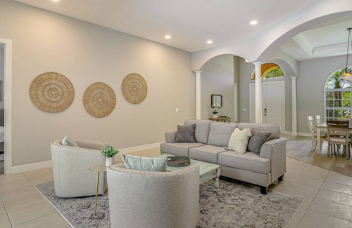 Less than five miles from the beach, this lovely four-bedroom home is the perfect place to experience a delightful Naples vacation with friends and family! Step inside to find a bright and modern living space filled with comfortable furniture, attractive decor, and cool tile floors. After a day at the beach, you can kick back in the living room to watch a ballgame or a good movie on the wall-mounted flatscreen TV. The full kitchen will make it easy to cook up your favorite meals when you take advantage of the small and major appliances, ample counter space, and center prep island. You can serve your dinner guests at the dining room table with seating or take your meals out to the patio for an alfresco dining experience. The breakfast table provides additional space along with bar seating for those quick afternoon snacks. Take some time out with a good read in the sitting room while the kids splash around in the pool. Later, you can toss everyone's swim trunks into the private washer and dryer for a spin while you catch up with old friends. Use the free WiFi to research a new outdoor adventure or connect to your social media friends. The central AC will ensure everything stays nice and cool on those hot summer days.