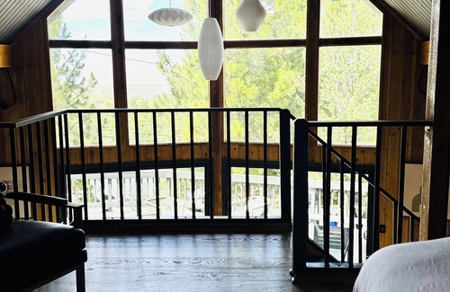 Step into an airy, design-forward retreat where mountain charm meets modern edge. The living room welcomes you with vaulted wood-beamed ceilings, floor-to-ceiling windows, and tons of natural light pouring in — perfect for reading, relaxing, or just soaking in the view.