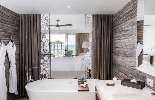 The contemporary design of the 1,313-square-foot One Bedroom Suite incorporates a variety of textures and tones with the purpose of enriching the guest experience while living in the space. The design concept is based on marine life. As you walk in, you will notice a stunning gourmet kitchen, complete with upscale appliances, a dining area that seats 4, and a living room with an entertainment center, a sleek 55-inch flat-screen TV, a sofa bed, and two lounge chairs with the geometry of coral. The middle table is a vault representing some type of treasure found in the depths of the oceans. Next to the kitchen, there is a full bathroom with a shower and washer and dryer for your convenience.