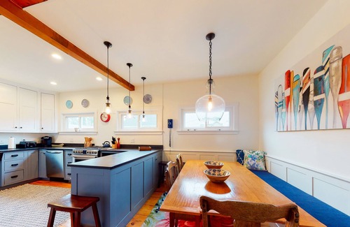 Original, wide-plank pine floors and wood-beamed ceilings embrace the history of the home while updated amenities and bright decor provide the comfort and convenience of a modern vacation home. You'll find a large living room, half bathroom/laundry, dining room and kitchen on the first floor. The large fireplace with wood-burning stove adds to the Maine cottage appeal. Custom cabinetry throughout the home provides ample storage and charm. The second floor provides two guest bedrooms, a full bath and a bright primary bedroom with water views. A Pack-N-Play is also provided for families traveling with small children.