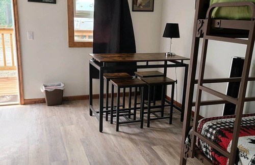 This unit is a dry cabin that has 2 bunk beds with a total of 4 twin beds, small refrigerator and microwave, small indoor dining table for 4, and an outdoor patio with a small bistro set for two people. Just a very short walk to the newly redone bathrooms. - AND BEST YET, ALL OVERNIGHT GUESTS GET TO ENJOY 10% OFF OF THE WOOD SHED RESTAURANT