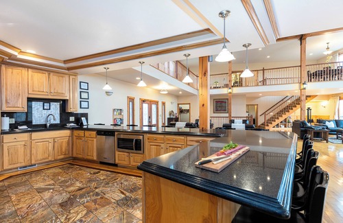 The Eagle's Nest is the largest private vacation rental home in the areawith its extraordinary 12,000-square-foot interior. It is one of the most exclusive and sought-after premier vacation rental properties in Galena. It is a one-of-a-kind "must-see/must-stay" property. As you enter the great room on the main level, you immediately feel the spaciousness and luxury. The floor-to-ceiling windows provide natural lighting and panoramic views of our surrounding wooded acreage. The great room's focal point is the floor-to-ceiling limestone wood-burning fireplace(wood supplied). The warmth of leather furniture surrounds it, as well as sizeable distinctive area rugs and natural hickory hardwood floors. To the left is an intimate library nook. The main level has an open-concept floor plan with twin dining tables(seating for 16)and a fully equipped gourmet kitchen. The L-shaped granite counter(seat 12)is perfect for buffet-style serving. Step out onto the 115-ft. main-level wood deck(tables and seating for 16), where you will find a 52-inch gas grill. Enjoy your favorite beverage, a barbeque, and the outdoors.