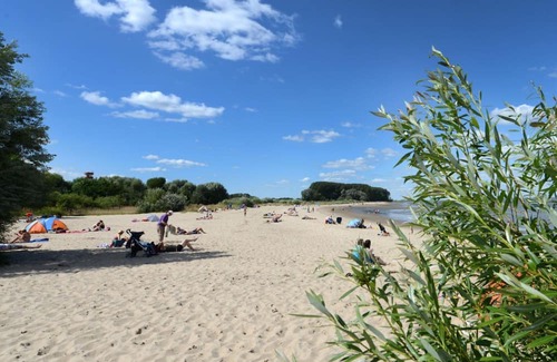 Comfortable holiday apartment on the Elbe island of Krautsand near the old country and Stade! There are space for up to 6 guests in 2 bedrooms, 1 bathroom and 1 living/dining room with open kitchen. The highlight is a direct view of the Elbe. The apartment is modernly furnished with great attention to detail and is on heromestone in the newly built Elbe beach Resort. The apartment is located directly on the long sandy beach and the Elbe.