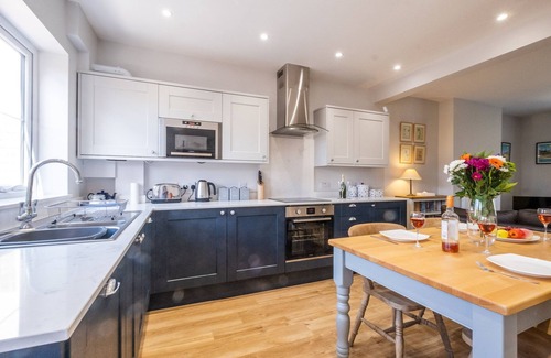 Open plan Kitchen/Dining/Sitting Room: Electric oven and induction hob, fridge/freezer, dishwasher, washing machine, dining table with four chairs and door leading to garden. The sitting area has two sofas and benefits from a gas fire, flat screen TV and Wi-Fi
