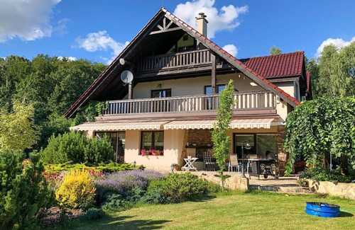 In a wonderful location, surrounded by a beautifully planted garden and close to the forest, this exceedingly comfortable vacation home with space for the large family awaits you. The attractive furnishings with neo-rustic charm create a cozy feel-good atmosphere in the rooms. Enjoy meals together with a view of the outdoors and then get the circulation going again with a game of billiards. At the end of a wonderful day, make yourself comfortable together in the living area and chat late into the evening while the flames in the fireplace crackle quietly.