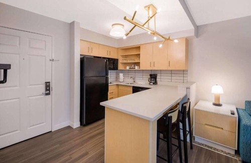 ✦ Your room is 775 sq. ft, equipped with complimentary toiletries, kitchen with basic amenities, high definition TV, available with Premium cable, ensuring cleanliness and comfort throughout your stay.