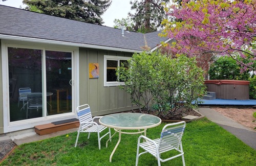 This open floor plan, 2 bdrm home (+3rd office room) is centrally located in Midtown Bend. The custom woodwork gives the house a warm and comfortable feel. The hot tub on the back deck will achieve the same effect! Both back and front yards are fenced for your pup. Across the street is a large park for recreation, including a fitness center with swimming pools, weight room, spa, sauna, steam room and fitness classes. This home is 1 block to Safeway, three blocks to a food cart pod , and <1/2 mile to the downtown strip (w/local breweries, restaurants, and shops). VRBO is a new site we are trying out, but check out our 4.7 star review on one of the other sites used for this.