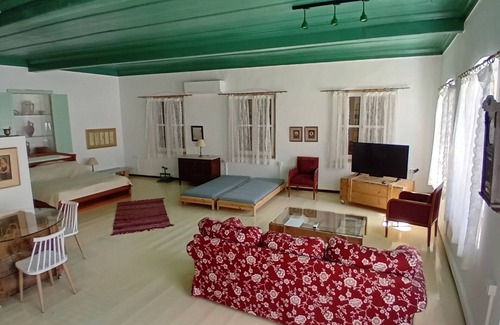 Its large double glazed windows, similar to living paintings by Symi herself, give the space the beauty, nobility and color it deserves. In a single space of 95 m2: 3 beds, a dining table for four people, a comfortable three-seater sofa, two armchairs, ceramic hob wi th four burnerselectric oven, refrigerator. Complete set of items for cooking and serving, WC, 50 inch TV,A/C.
