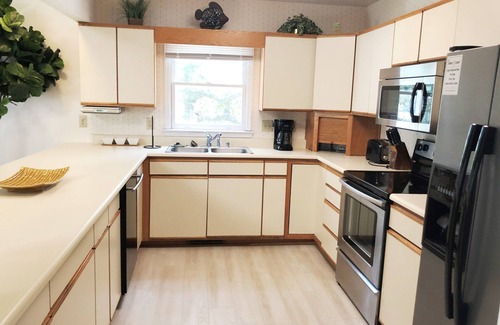 Sleeps 10 ~ 3 Bedrooms/ 2.5 Baths: (2) King, (1) Queen beds, (1) Set of Bunks, (1) Daybed with trundle and futons. WiFi internet. Large flat screen TV in LR with DVD theater sound system. TV's have Roku with Spectrum Cable. Well equipped kitchen with large open counter w/bar stools. Dining room has a large six chair table. Open living area has plenty of seating with full couch and three singles. Natural oak tree shaded Carolina room on front of home with additional table and chairs. Master bath has a Jacuzzi tub and both levels have decking to enjoy the outdoors. Garage with ping pong table. Additional refrigerator located in ground floor laundry room. Outdoor shower, outdoor gas BBQ grill.