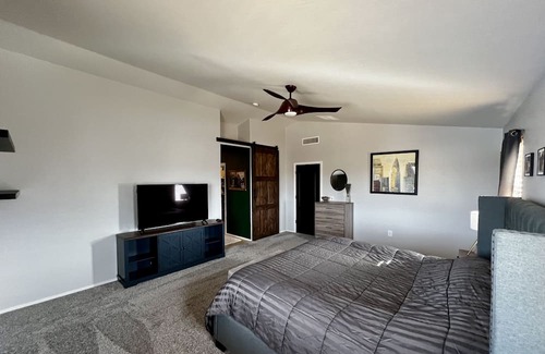 Extra spacious home with full kitchen and open floor plan. Relax on the oversized living room sectional or enjoy a cup of coffee on the covered patio, shaded by the passion vine trellis. In the evenings, unwind with a glass of wine beside the outdoor fireplace under the gorgeous pergola and admire the beautiful starry sky. You'll find one full bath and one large bedroom downstairs with a desk for a private workspace. Upstairs you'll find 4 bathrooms and two full baths. The master bedroom has a smart tv and a large king bed with an electric bed frame to elevate the head/feet. The master bath is separated by a large barn door and features double sinks, spacious shower and a separate bath tub, a large walk-in closet and separate toilet. Two spare rooms each have a queen bed with dressers and closets for clothing. The final bedroom has bunkbeds and a smart TV with a Wii gaming console. The 3rd bathroom also has double sinks and all 3 bathrooms have bidets and updated shower heads.