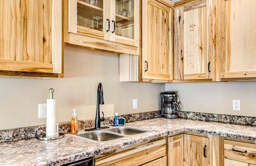 Upon entering the cabin, a bright interior and a cozy atmosphere greet you throughout the well-appointed living area. Enjoy the whimsical theming throughout the space, from the decor to the rustic and modern furnishings. Relax and make yourself at home by resting on the plush furniture, streaming a movie marathon on the large TV, or curling up with a good book by the crackling fire in the grand stone fireplace. The open-concept floor plan was designed with togetherness in mind so that no conversation would be lost here. Prepare grand meals and outdoor adventures snacks in the sophisticated eat-in kitchen, boasting brand-new appliances, ample cupboard room, and a formal dining table. Host barbecues or sip your morning coffee on the patio while listening to the tranquil sounds of nature.