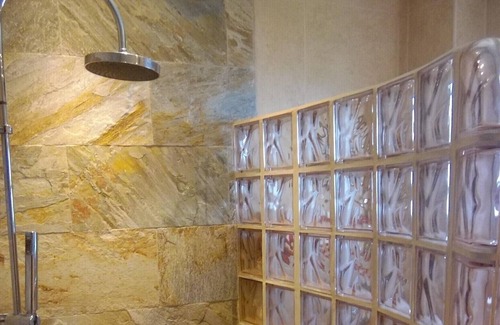 * Bathroom with large walk-in natural stone rain shower, toilet and sink