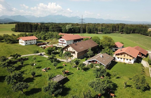 Hof in ruhiger, schöner Aussichtslage mit zwei Ferienwohungen für 1 bis 4 Personen mit Bergblick und Seenähe. Entfernung zum Ort Riedering 1,8 km. Zum Tinningersee 800 m, zum Simssee 3 km. Ausflugsmöglichkeiten nach Rosenheim 6 km, nach München 65 km, Salzburg 80 km oder Innsbruck 90 km.