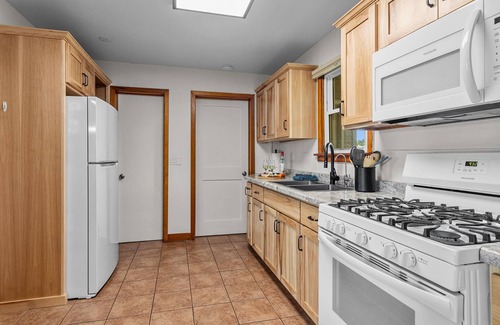 Fully equipped with modern appliances: stove, refrigerator, microwave, toaster, blender, washer, and dryer