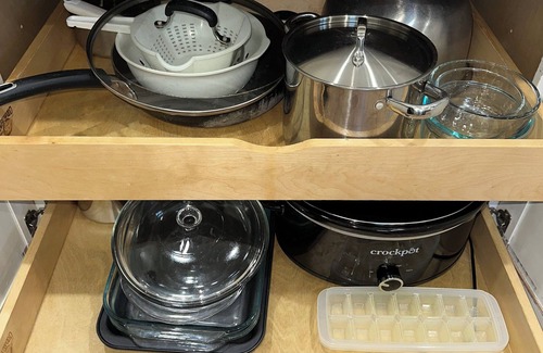 ~ Kids arts & crafts in kitchen cabinet below countertop, below fish tank.
