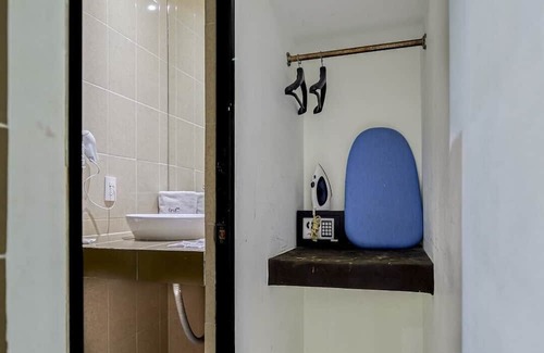 -Full bathroom with towels, hygiene amenities, hair dryer, clothes iron and hot water.