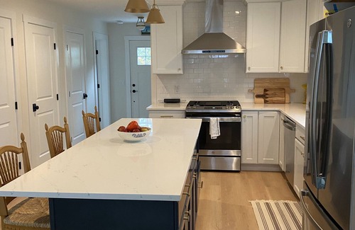 The house boasts an open kitchen, dining and living room plan, ideal for socializing. Our kitchen island seats three and our dining room seats eight. A powder room at the entrance is convenient for your visitors. Our home office is a quiet and private place for reading, catching up on work, yoga and more.