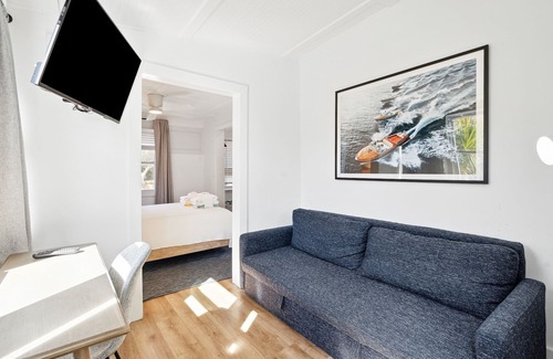Room 31 - The Streamliner. This spacious 2nd floor guest room has a covered porch entry area. The suite is comfortably furnished for up to 3 guests with a queen-sized bed and a twin daybed that doubles as a couch. The private bathroom is beautifully outfitted with a tub and shower. Take a dip at the largest pool on Folly Beach or spend some time in the surf with beach access only 1 block away. Amenities include a mini refrigerator, microwave, smart TV, and free WIFI. Great for a small family getaway!