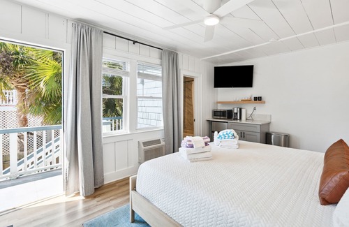 Room 22 - The Torpedo. This luxurious guest room has a private entry located on the second floor. The room is elegantly furnished with a king-sized bed, mini refrigerator, microwave, free WIFI, and smart TV. The private bathroom is beautifully outfitted with a tub and shower. Take a dip in the largest pool on Folly Beach or spend some time on the sand with beach access only 1 block away. This is the perfect spot for your romantic beach getaway!