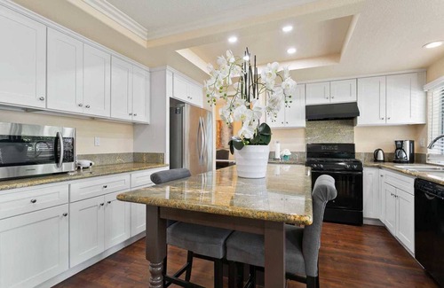 • Remodeled Kitchen Equipped with Granite Counter Tops and a Spacious Center Island