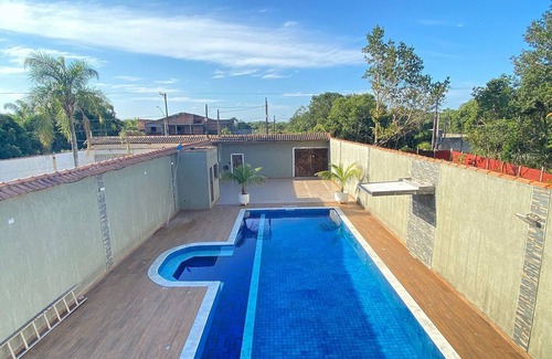 Enjoy incredible moments with your family and friends in the best location on the south coast of SP. We are located just 800 meters from the beach, on a quiet and supervised street. The house offers 6 large bedrooms equipped with a double bed and 2 single bunk beds, all equipped with ceiling or pedestal fans, toilet, full kitchen, TV room, dining room. Barbecue, wood-burning stove and pizza oven, swimming pool, shower, tables, parasol, pool and foosball table and gym.