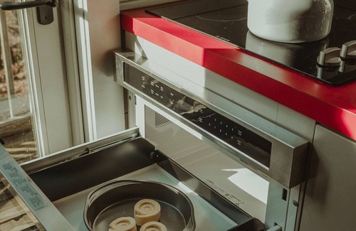 The fully equipped kitchen has a sink, stove, cookware and refrigerator. Please Note: This tiny house is on a well and does have hard water. The water is potable, but may have an odor. We also provide at least 2 5-gallon jugs of filtered water. Other amenities include: air-conditioning, heat, fire pit, and easy road access.