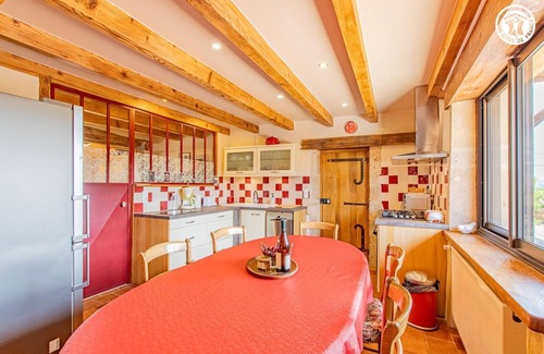 Passionate about vintage cars (having partly inspired the "decoration" of the cottage), Nicole & Paul welcome you to an elegant, authentic, traditional 19th-century farmhouse, carefully restored, nestled in the peace and quiet of the unspoiled Charolais countryside (on a site protected as a ZNIEFF for its rich fauna and wildlife), on the edge of one of the smallest villages in Saône-et-Loire. Absolute tranquility, nestled on the edge of meadows, on the edge of a beautiful wild forest, in the heart of the magnificent local bocage (home to the peaceful and famous Charolais cows in season). Soothing, preserved setting of nature and greenery. A true haven of peace and rest offering the rare privilege of being able to observe wildlife (roe deer, hares, foxes, birds of prey, dormice, numerous birds, etc.). Very comfortable cottage. Ultra spacious. Large living room. Warm country charm with contemporary accents, enhanced by the rich traces of the original building (fireplace mantel, lintels, stone niches and pillars, terracotta tiles, beams, etc.). Enormous charm and character. Cozy and cozy. Exposed terrace complemented by a vast sheltered terrace. Very pleasant 1-hectare property carefully lawned, planted, with flowers and trees (cherry, pear, peach, and mirabelle plum trees, etc. / picking possible), housing an unusual small pond (with frogs and goldfish) and a "natural" pétanque court in the courtyard. Composition: Gite adjoining the owners' house (complete independence). Wi-Fi (fiber). Mixed central heating (wood/oil). Air conditioning upstairs. Ground floor: living room-kitchen-lounge (sofa bed 130x190cm as an extra "sleeping area"), bedroom (double bed 140x190cm) with TV & private bathroom (shower/WC), bathroom (shower), separate WC. 1st floor: bedroom (double bed 140x190cm + single bed 90x190cm), TV lounge on the mezzanine, bathroom (bath/WC). Terrace + sheltered terrace + private parking. Shared garden (1 ha). Amenities including supermarket 7.5 km.
