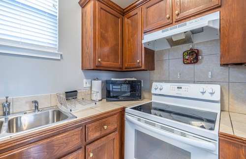 Full Kitchen — Equipped with stove, refrigerator, microwave, and a separate laundry area for added convenience.