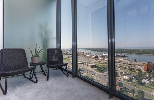 Our sun-soaked apartment is located on the 28th floor of the tallest residential-only building in all of the Baltic States with breath-taking views of the sea and the city. It is minutes walking away from the ferry to the Curonian Spit - Neringa, shopping center Akropolis and the Svyturys Arena. The guests have an access to the rooftop terrace on top of the 34th floor, with splendid views of the whole city, the sunbeds are also there for your convenience. We want your stay at our place to be the best. Never hesitate to call, communicate with us for any tips, suggestions, directions etc...