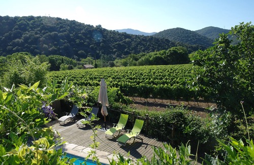 The property comprises a 250 year old Languedoc farmhouse and a separate gite, both renovated to a very high standard and situated in a delightful small hamlet hidden among the vineyards and olive groves with wonderful views. Each house is private, completely self contained and built around a superb private 8 x 4m pool, with Roman steps, extensive terracing, summer kitchen, BBQ, wood fired pizza oven, and decked sun terrace. A small olive grove provides further room for children to play in. Normally the owners stay in the farmhouse for the majority of the summer giving the gite occupants exclusive use of the pool and grounds. However both properties are available for rental together. The local village, 10 minutes walk from the hamlet, provides shops, tourist information and restaurants. Golf course within 15 minutes. Wonderful walking, climbing, canoeing and river swimming in the immediate vicinity. Mediterranean beaches an easy drive away. Great choice of cycling routes, ranging from the nearby converted railway line to the most extreme mountain tracks, four adult bikes are provided. Excellent choice of restaurants locally. You are spoilt for choice for wine tasting at the many local vineyards. Ideal holiday location for all ages.