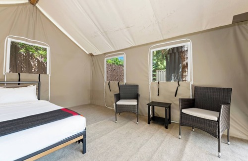 Enjoy our furnished, massive 16'X20' camping tent. Red Tailed Hawk boasts a welcoming interior featuring a plush queen-size bed for a restful night's sleep. A cozy seating area provides an intimate space to relax, unwind, and savor the scenic surroundings. Designed with your convenience in mind, our tents include ample storage space for luggage, ensuring a clutter-free and comfortable atmosphere. For your utmost comfort, the nearby bathrooms and showers in our brand new comfort station are equipped with heating, and accessible bathrooms and showers are also available.