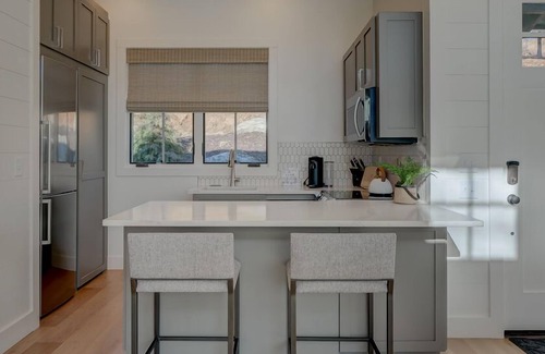 These cute, 500-square-foot Appalachian-style cottages, include an exterior of stacked stone, board and batten, and cedar shake roofing. Interiors, designed by New Blue Home, a Blue Ridge design firm, offers a cozy living room with ample space to relax and unwind, a full kitchen complete with sink, ample counter space and bar seating, wine fridge, ice maker, oven, microwave, Nespresso Vertuo Coffeemaker, and a washer/dryer to freshen up clothes after a hike or a day on the links. The cottages offers a separate bedroom with a king-size bed and a private bath with a tiled shower. Flat-screen smart TVs are located in both the bedroom and living room as well as window treatments for privacy. Delightful hardscaping surrounds the cottages, and a stone patio invites you to sit back and enjoy the fresh mountain air and sounds of nature. Two Adirondack chairs allow you to chill out and soak in the view overlooking the Award-Winning golf course and the Toccoa River. All guests are invited to The Tavern for a complimentary glass of wine, from 3:00 to 5:00, prior to a reserved dinner reservation.