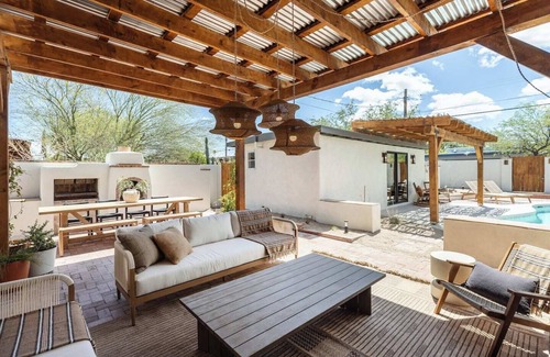 Welcome to our fully restored pueblo-style home in historic Blenman Elm! Just minutes from the U of A, trendy restaurants and walking distance to coffee shops, this 3BR/2BA home plus 1BR/1BA casita features a pool, hot tub, and amazing desert-modern vibes. Thoughtfully designed with artisan details, it’s the perfect spot to relax, explore, or work remotely. Enjoy the rich culture, food scene, and peaceful energy of this one-of-a-kind retreat.
