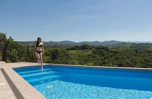 This luxurious and elegant holiday home is located in a quiet, idyllic village with more than 10,000 m² of land surrounded by fruit trees, olive groves and vineyards. On hot summer days, you can take a refreshing dip in the pool. For complete relaxation, enjoy Finnish and infrared saunas as well as the hot tub, from which you can enjoy a marvellous view of the surrounding hills. The house is equipped with a smartboard, a sound system and air conditioning connected throughout the house, providing maximum comfort. You can arrange breakfast service or olive oil, wine and sparkling wine tasting with the owner. The location of the house is ideal for excursions to neighbouring Italy or to the natural beauties of the surrounding area: the Kocjan and Postojna caves, Triglav National Park or the magical Lake Bohinj.