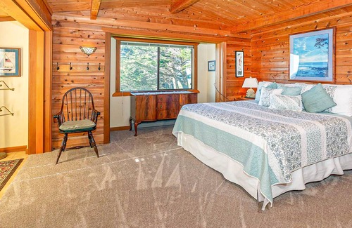 A well-equipped kitchen has an open floor plan which flows into the dining area and living room with comfortable, new furniture and a warm, inviting gas wood stove. From this room, a slider opens onto a sunny deck overlooking the ocean. From here, take in the view of gorgeous, colorful sunsets, fishing boats gliding along the horizon, and an abundance of wildlife surrounding the property! There is also a protected back patio area, which is a great place for watching the warm sunrise while sipping your morning coffee.